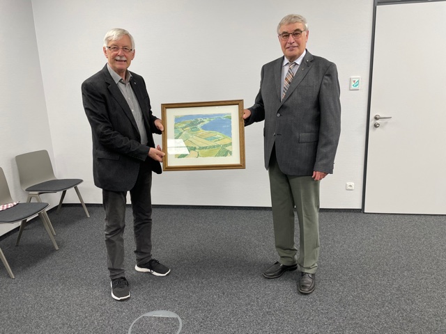 Mit einem Claus Vahle-Aquarell „Haithabu“ dankte der CDU-Ortsvorsitzende Holger Schwien ihm für seinen unermüdlichen Einsatz für die Gemeinde und den Ortsverband.