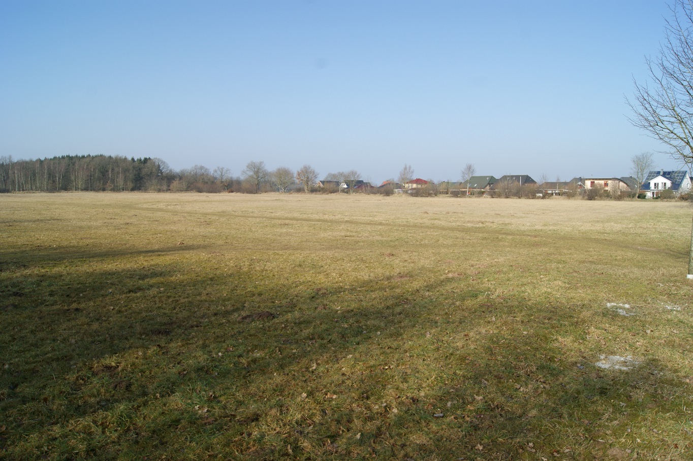 Dieser gut 3 ha konnten zum damaligen Zeitpunkt leider nicht mit in die Planung einbezogen werden, weil die Bundeswehr ihre Lärmemissionswerte dort nicht für eine reine Wohnbebauung senken wollte. Es handelt sich im Übrigen um die gleiche Koppel, auf der die Anwohner alle selbst gebaut hatten (siehe die zwei Bilder aus Süd- und aus Nordansicht).