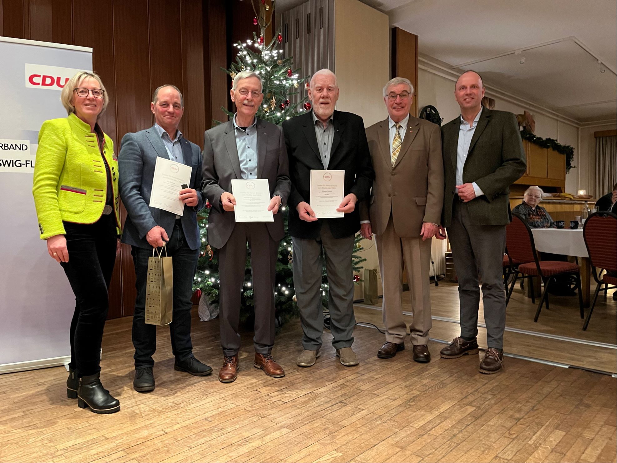 Unsere Kreisverbandsvorsitzende Petra Nicolaisen und MdB sowie Andreas Hein (MdL) ehrten Ulrich Brüggemeier und Jürgen Schult für ihre 40-jährige und Jan Frahm für seine 25 Jahre treue Verbundenheit zur CDU und dankten ihnen für ihr beispielgebendes kommunalpolitisches Engagement. In meiner Laudatio hob ich die besonderen Verdienste unseres Alt-Kreispräsidenten Uli Brüggemeier sowohl in der Gemeinde, dem Amt als auch im Kreis SL-FL hervor. Dafür wurde er mit der Freiherr-vom-Stein-Verdienstnadel des Landes ausgezeichnet. (Bild v.l.n.r.): P. Nicolaisen, J. Frahm, U. Brüggemeier, J. Schult, H. Schwien. A. Hein)