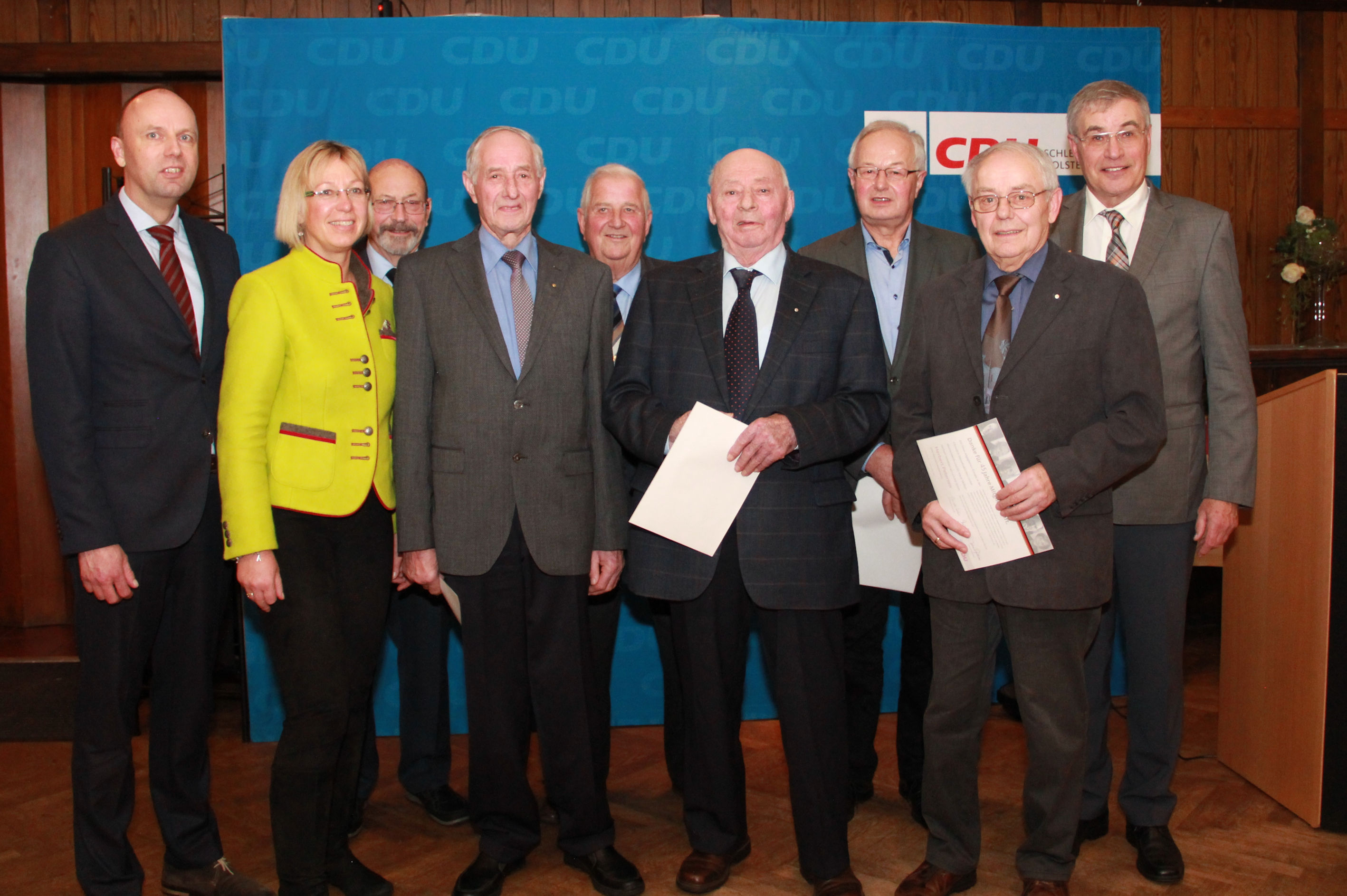 Es ist eine gute Tradition, bei dieser Veranstaltung langjährige CDU-Mitglieder des Ortsverbands für ihre treue Verbundenheit zur Partei ehren. Zur Laudatio von Holger Schwien nahmen Petra Nicolaisen und Andreas Hein, stellvertretend für den an Grippe erkrankten, abwesenden CDU-Kreisvorsitzenden Johannes Callsen (MdL) die Ehrungen der sechs Jubilare vor (siehe Bild).